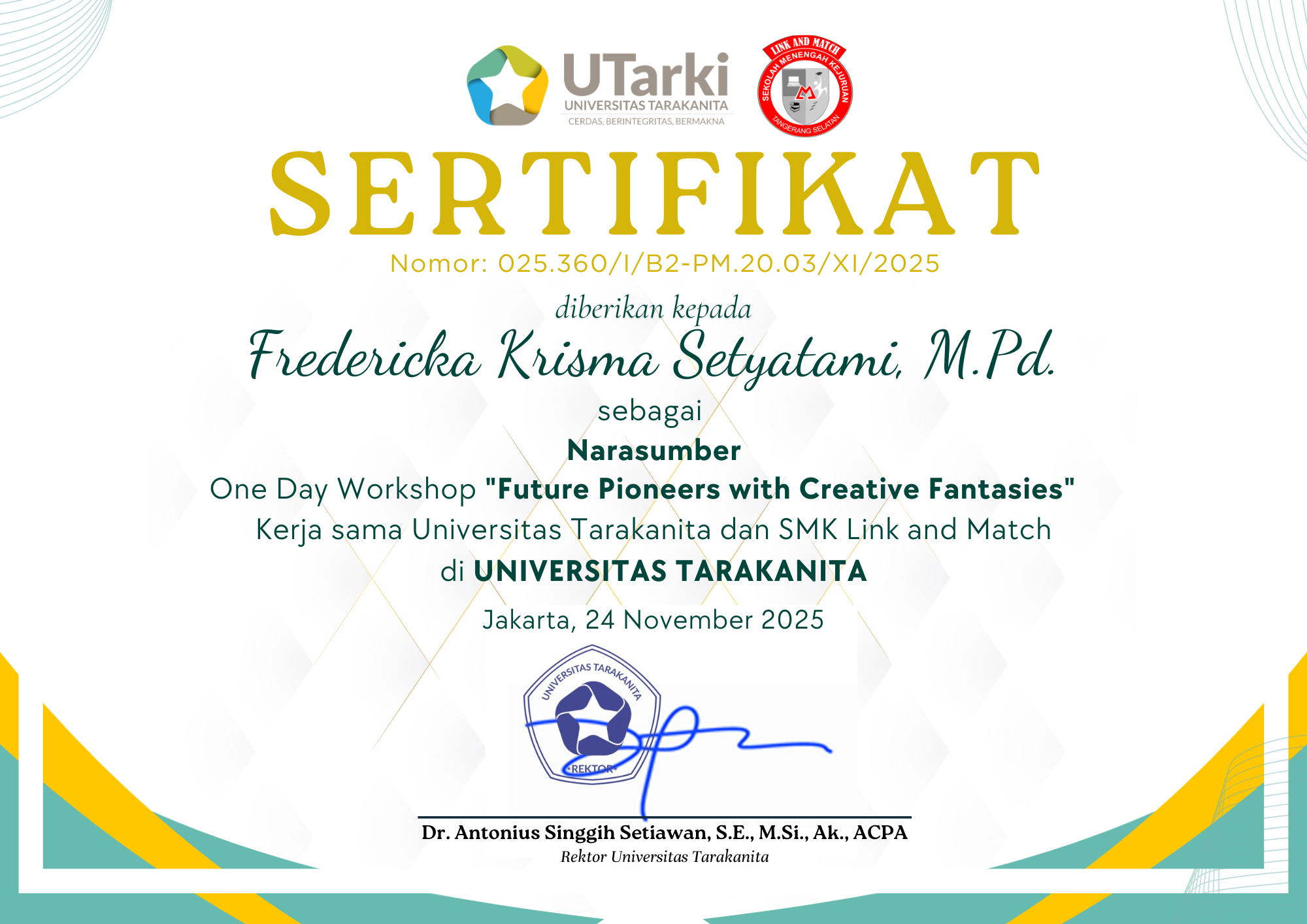 Setyatami, Fredericka Krisma Sertifikat Pemateri Kegiatan Workshop SMK Link & Match. Universitas Tarakanita. (Unpublished)
